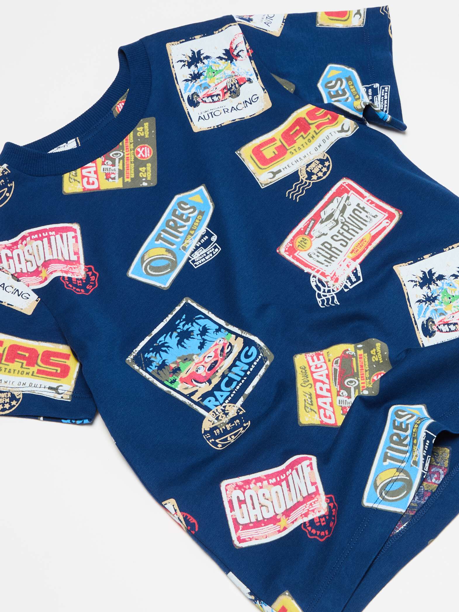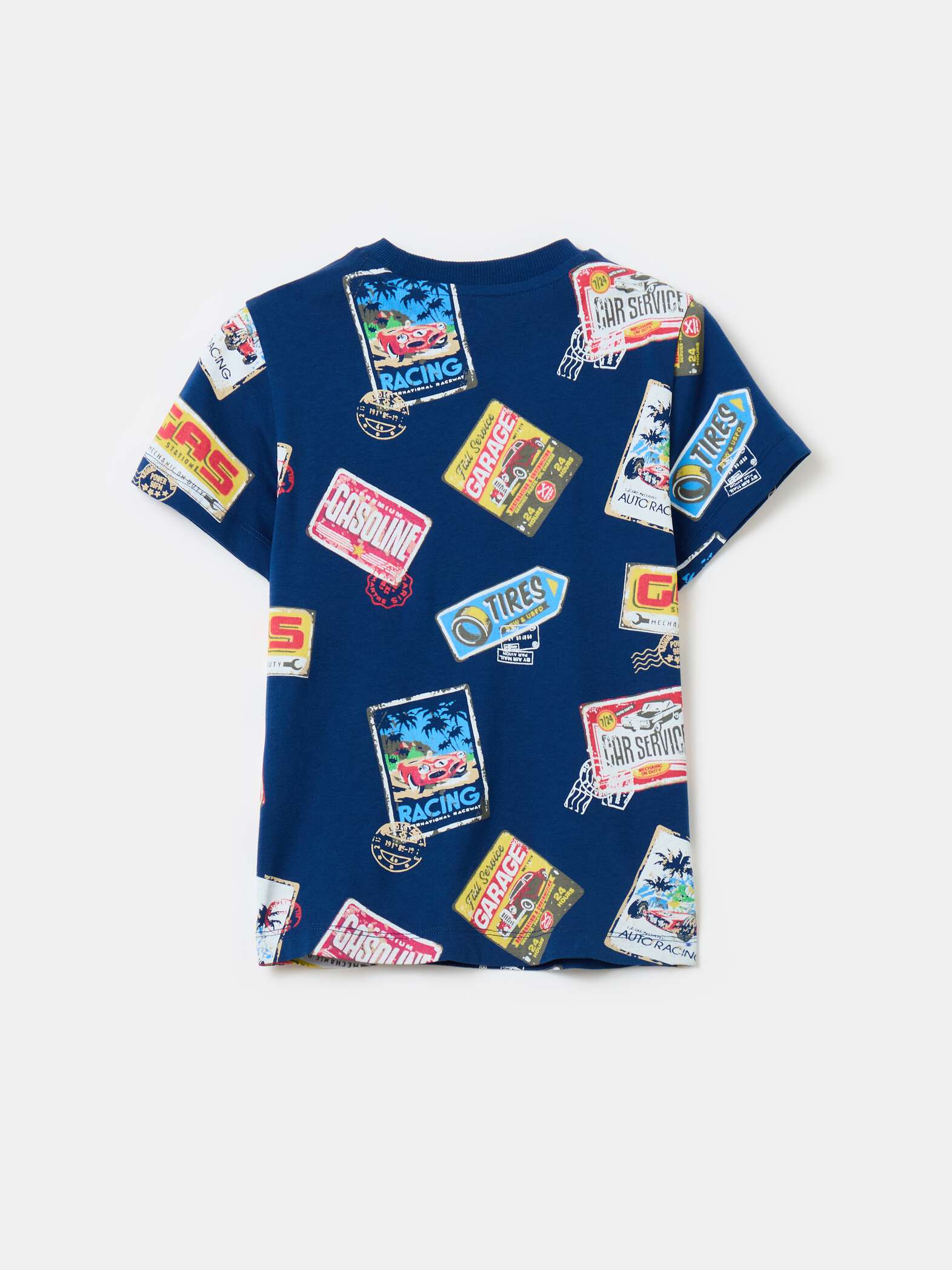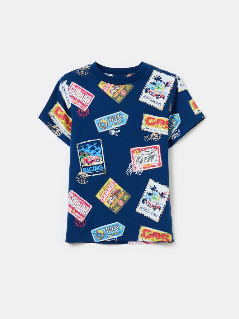100% cotton T-shirt. Round ribbed neck. All-over race car motif patch print.