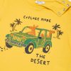 100% cotton T-shirt. Round neck with snap buttons on the shoulder. Kangaroo and camel safari print with wording on the front.