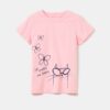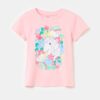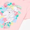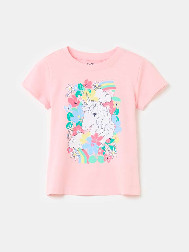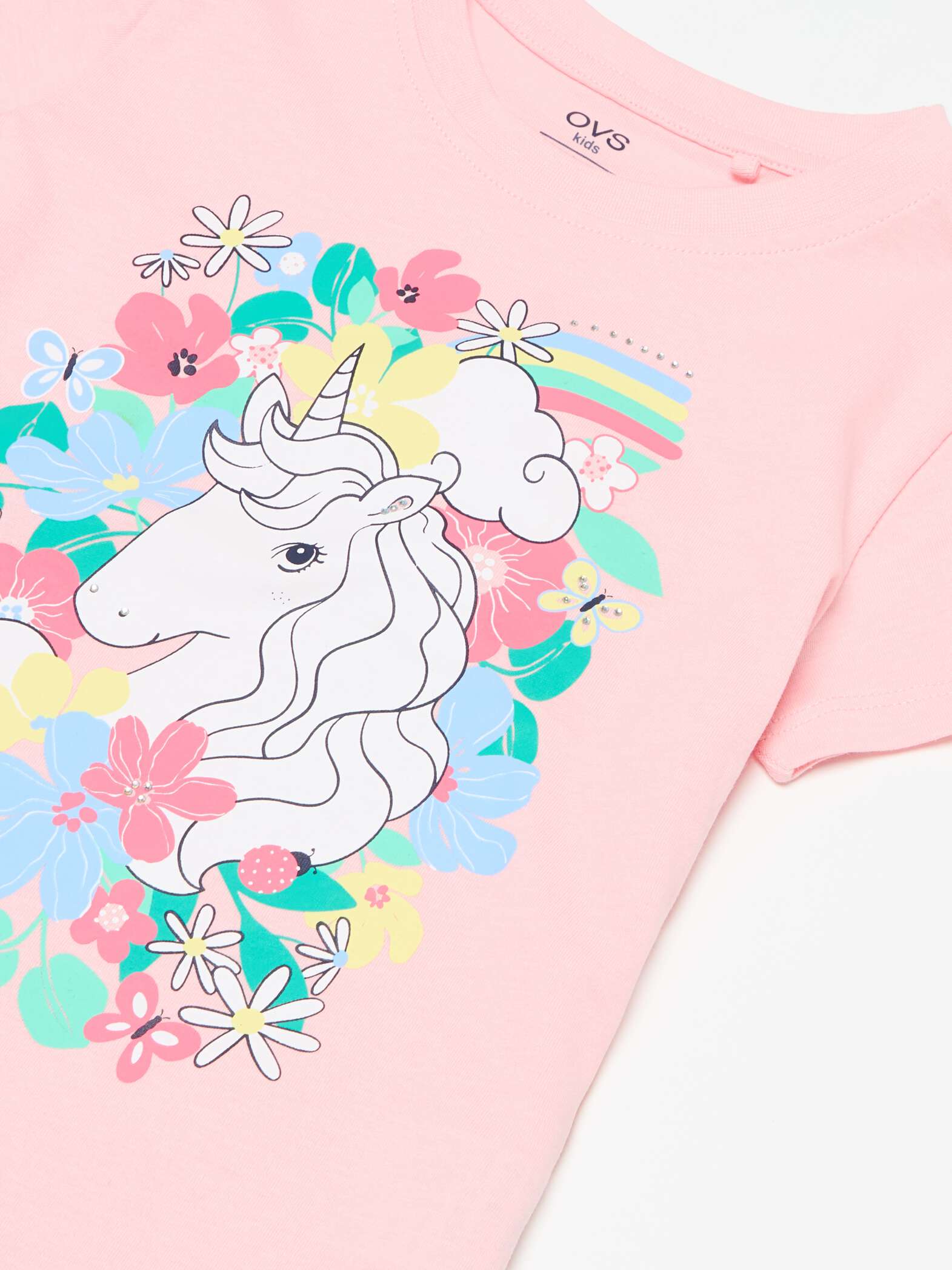 Tee-shirt 100% coton. Col rond. Imprimé licorne avec fleurs, nuages et strass sur le devant.