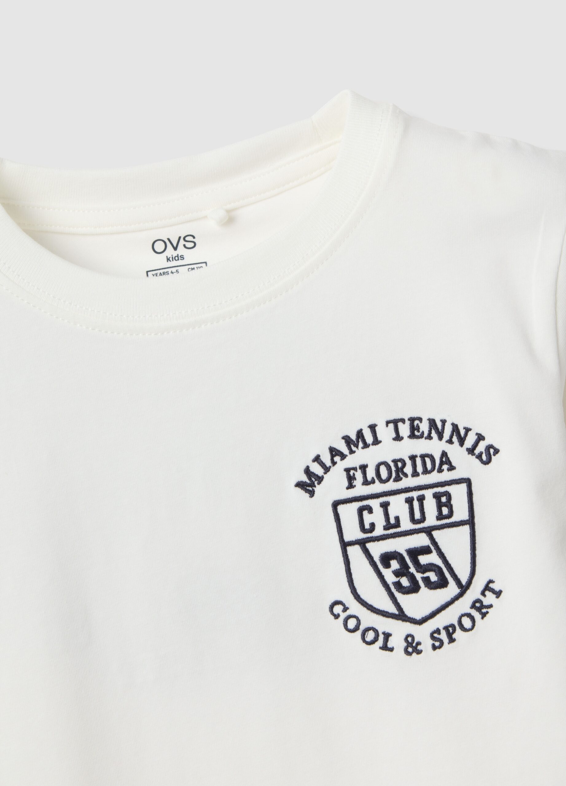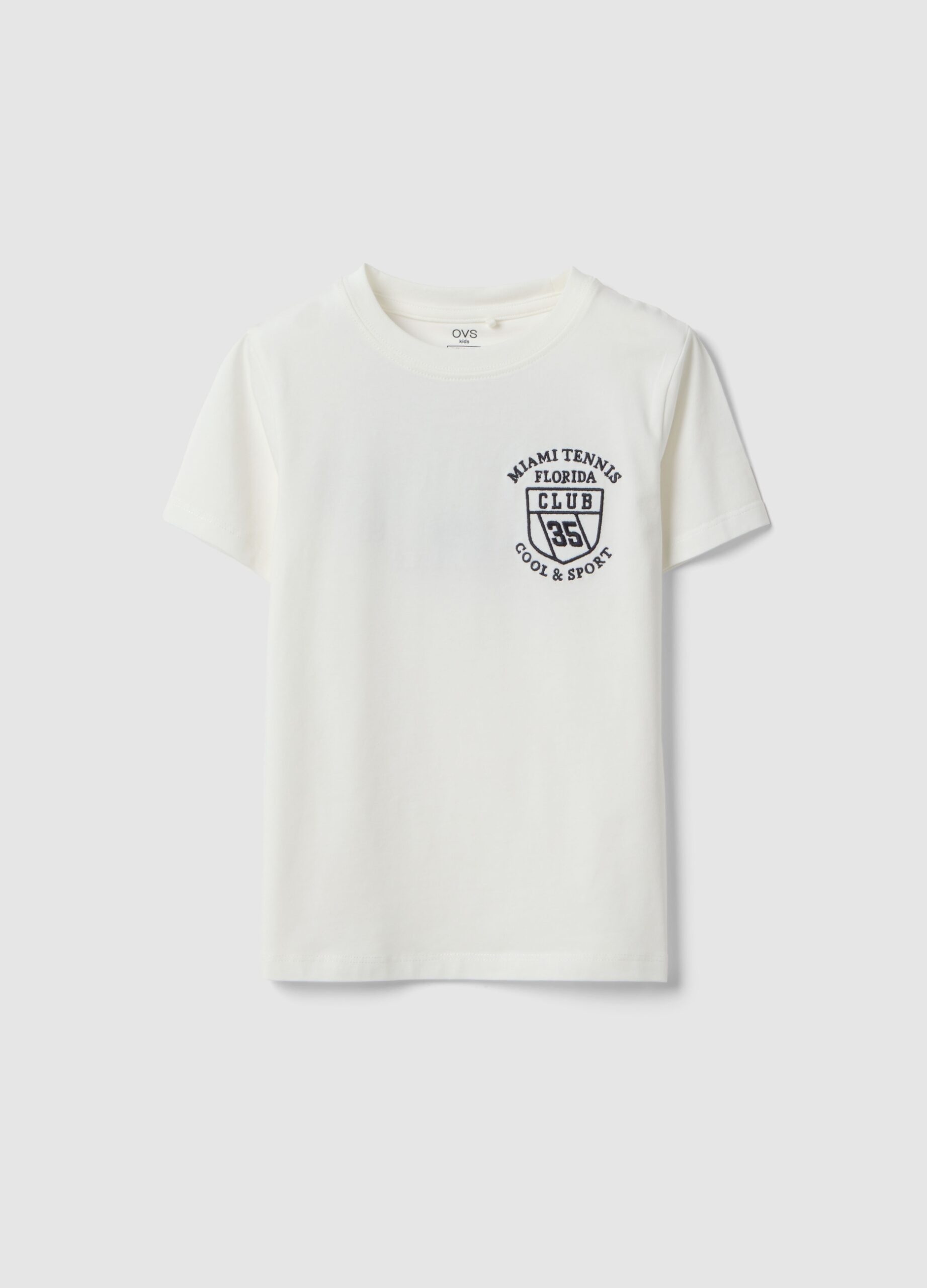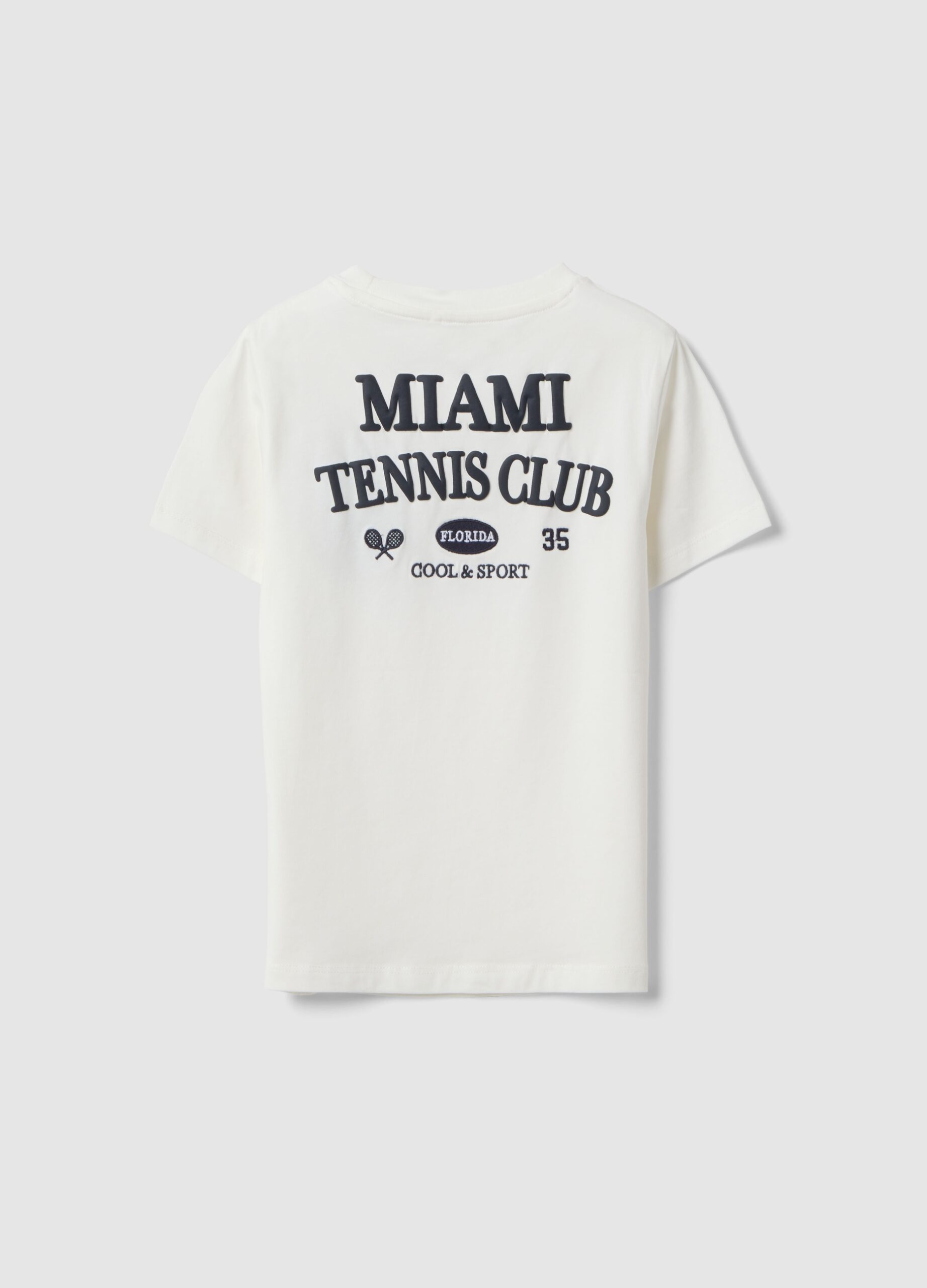 Ce t-shirt blanc de la ligne OVS KIDS est confectionné en coton extensible, assurant confort et liberté de mouvement aux enfants de 3 à 10 ans. Son design oversize à manches courtes et encolure ronde le rend idéal pour les chaudes journées d’été. Le tissu doux et respirant assure une fraîcheur parfaite à tout moment de la journée. Un vêtement polyvalent, orné du logo « Miami Tennis Florida » sur la poitrine.