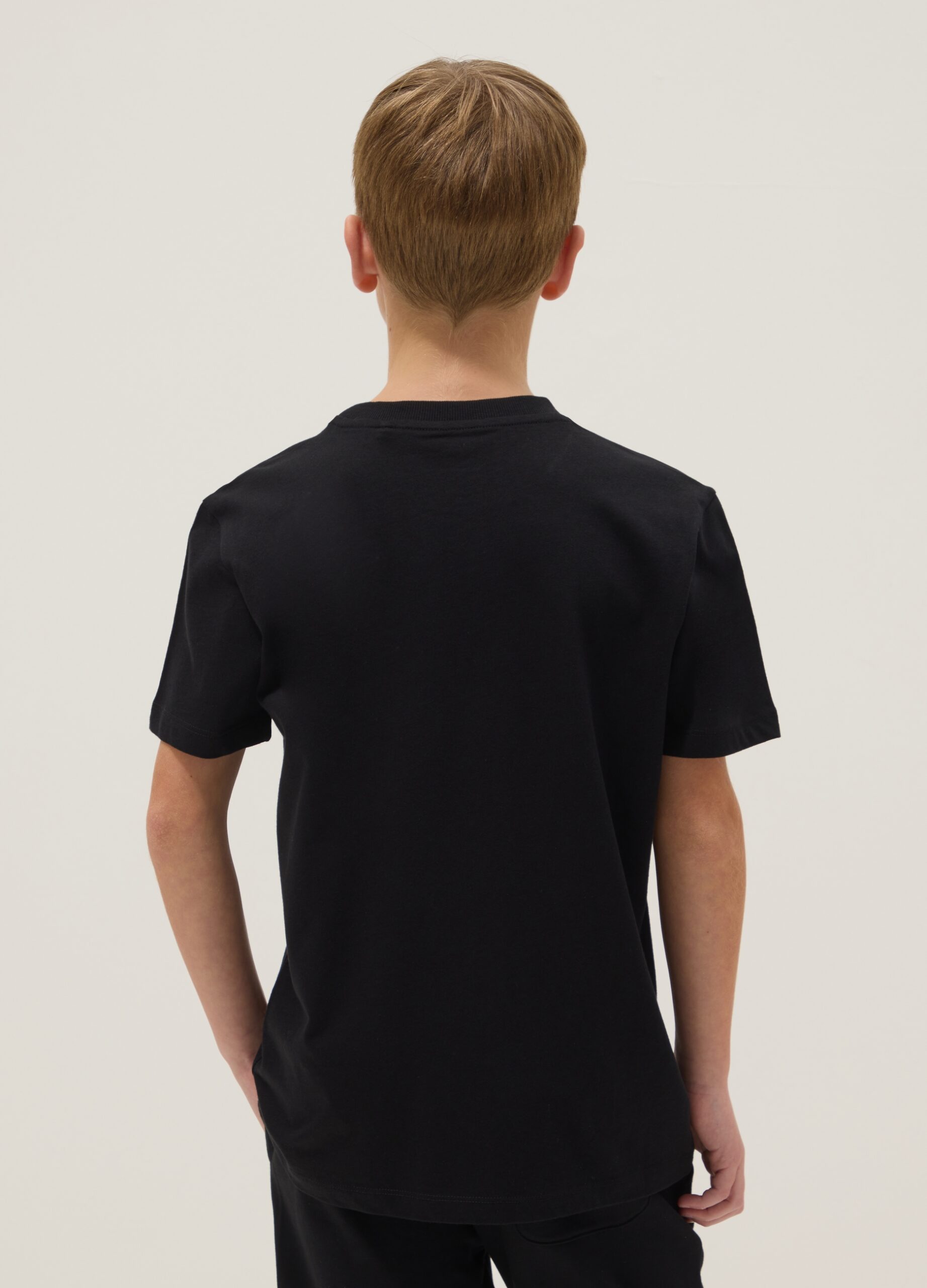Le t-shirt noir de la ligne OVS KIDS, confectionné en pur coton, est parfait pour les garçons de 10 à 15 ans. Avec une coupe classique et des manches courtes, il assure confort et fraîcheur lors des journées chaudes. Le col rond et le design simple avec l’imprimé « Swag » en font une pièce polyvalente, idéale pour la saison printemps/été.