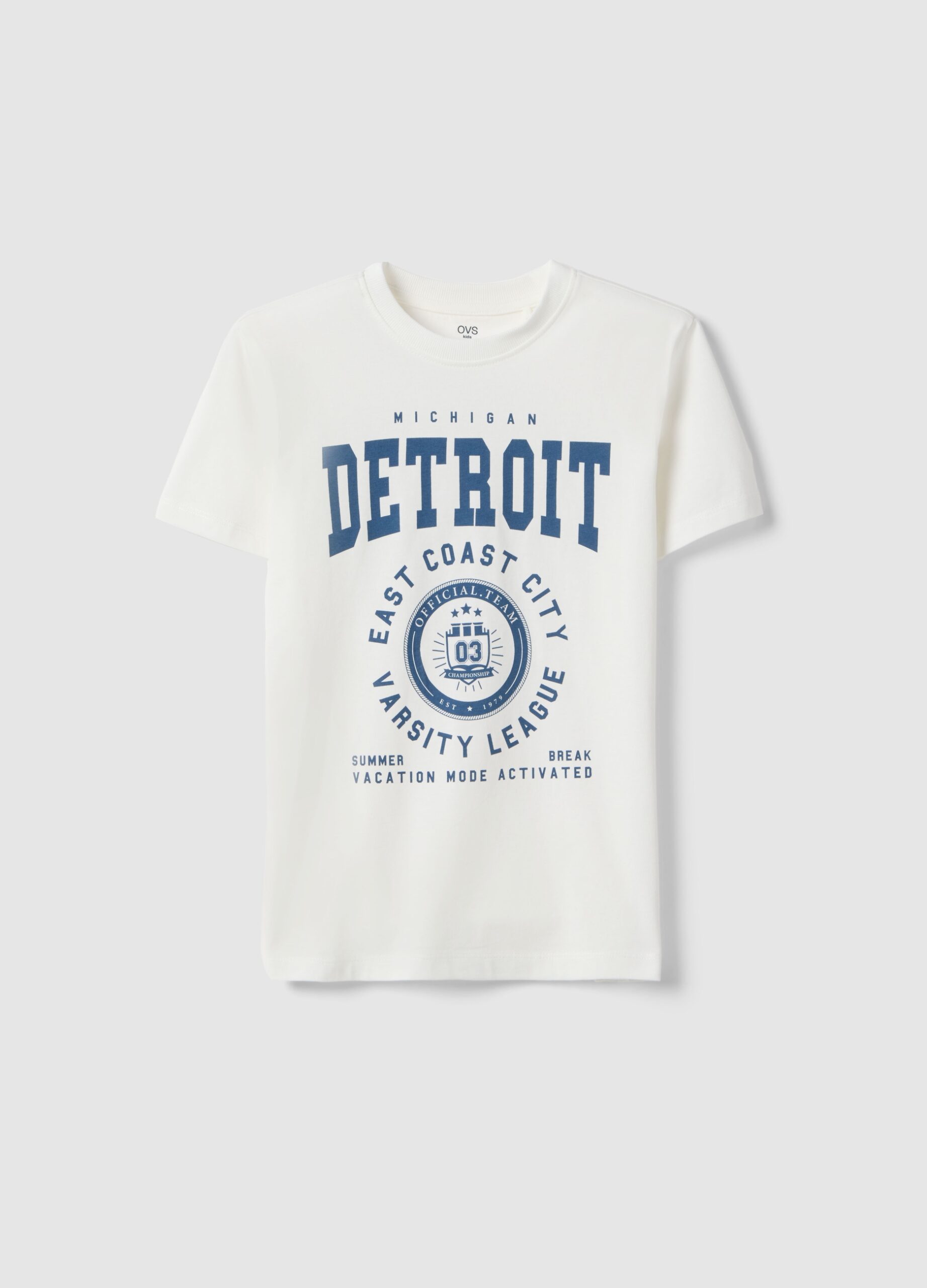 Le T-shirt blanc de la ligne OVS KIDS, confectionné en pur coton biologique, est idéal pour les garçons âgés de 10 à 15 ans. Il présente un motif imprimé simple « Detroit » et une coupe classique pour plus de confort pendant l’été. L’encolure ronde et le tissu doux en font un vêtement polyvalent et pratique.