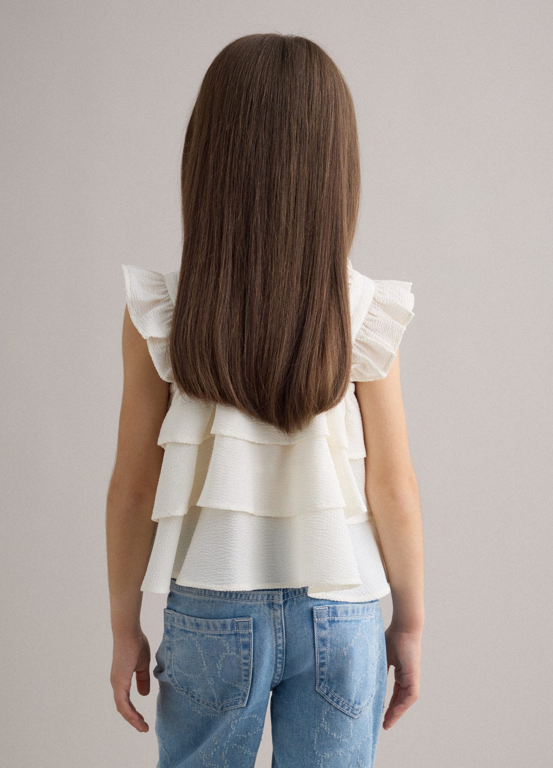 Le haut blanc de la ligne PIOMBO KIDS est destiné aux filles. Ce modèle présente un design avec des volants qui ajoutent une touche de dynamisme. Les larges bretelles assurent une coupe régulière confortable, idéale en toute occasion. Un vêtement polyvalent et pratique, parfait pour compléter la tenue quotidienne des petits.